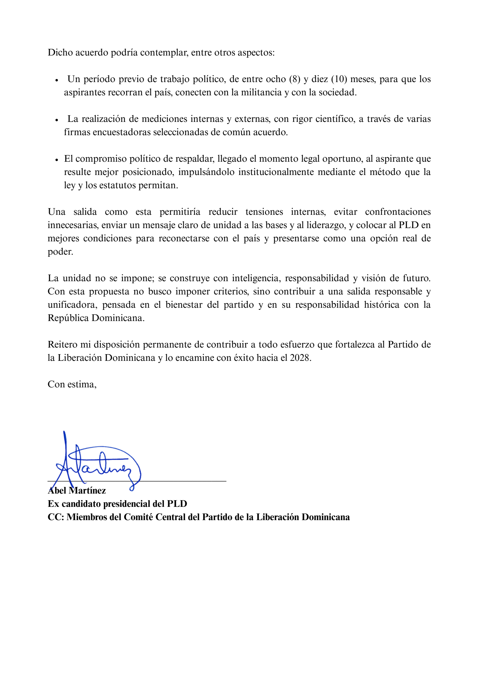 La propuesta presentada plantea una salida política equilibrada, que permita al partido mantenerse activo, organizado y conectado con la sociedad, sin adelantar mecanismos formales de selección ni caer en la inercia de esperar sin preparación previa. En ese marco, Abel Martínez sugiere propiciar un acuerdo político voluntario entre los aspirantes presidenciales, basado en la buena fe y el compromiso con el interés superior del partido.